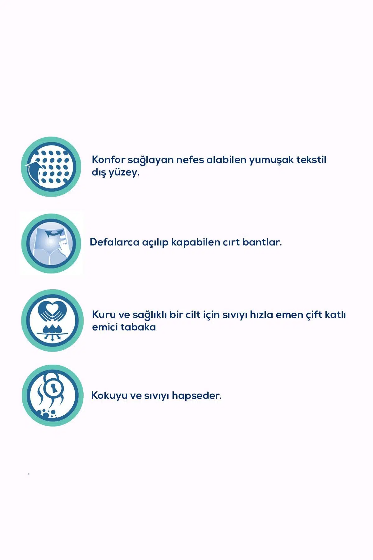 Defalarca açılıp kapanabilen cırt bantları ve esnek bel bandı, bezin vücuda sıkı bir şekilde oturmasını sağlar.